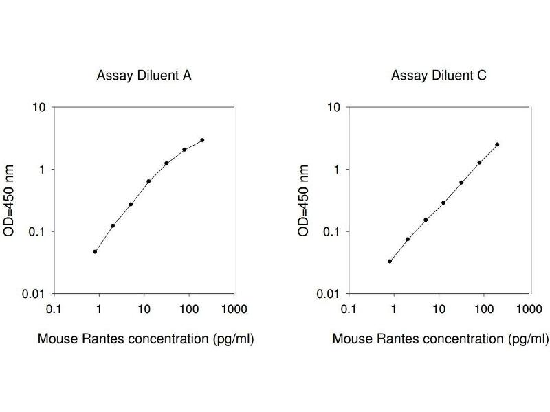 1. Bring all reagents and samples to room temperature (18 - 25°C) before use. 2. Sample dilution: Assay Diluent A (Item D) is used for dilution of serum/plasma samples, Assay Diluent C (Item L) can be used for dilution of cell culture supernates. 3. Assay Diluent B should be diluted 5-fold with deionized or distilled water before use. 4. Preparation of standard: Briefly spin the vial of Item C and then add 400 µl Assay Diluent A (for serum/plasma samples) or Assay Diluent C (for cell culture supernates) into Item C vial to prepare a 50 ng/ml standard. Dissolve the powder thoroughly by a gentle mix. Add 4 µl RANTES standard (50 ng/ml) from the vial of Item C, into a tube with 996 µl Assay Diluent A or Assay Diluent C to prepare a 200 pg/ml standard solution. Pipette 300 µl Assay Diluent A or Assay Diluent C into each tube. Use the 200 pg/ml standard solution to produce a dilution series (shown below). Mix each tube thoroughly before the next transfer. Gently vortex to mix. Assay Diluent A or Assay Diluent C serves as the zero standard (0 pg/ml). 5. If the Wash Concentrate (20x) (Item B) contains visible crystals, warm to room temperature and mix gently until dissolved. Dilute 20 ml of Wash Buffer Concentrate into deionized or distilled water to yield 400 ml of 1x Wash Buffer. 6. Briefly spin the Detection Antibody vial (Item F) before use. Add 100 µl of 1x Assay Diluent B into the vial to prepare a detection antibody concentrate. Pipette up and down to mix gently (the concentrate can be stored at 4°C for 5 days). The detection antibody concentrate should be diluted 80-fold with 1x Assay Diluent B and used in step 4 of Part VI Assay Procedure. 7. Briefly spin the HRP-Streptavidin concentrate vial (Item G) and pipette up and down to mix gently before use. HRP-Streptavidin concentrate should be diluted 10,000-fold with 1x Assay Diluent B. For example: Briefly spin the vial (Item G) and pipette up and down to mix gently . Add 2 µl of HRP-Streptavidin concentrate into a tube with 198 µl 1x Assay Diluent B to prepare a 100-fold diluted HRP- Streptavidin solution (do not store the diluted solution for next day use). Mix through and then pipette 100 µl of prepared 100-fold diluted solution into a tube with 10 ml 1x Assay Diluent B to prepare a final 10,000 fold diluted HRP-Streptavidin solution.