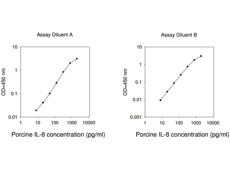 Typical Data: These standard curves are for demonstration only. A standard curve must be run with each assay. Assay Diluent A Porcine IL-8 concentration (pg/mL) 1 10 100 1000 10000 O D =4 50 n m 0.01 0.1 1 10 Assay Diluent B Porcine IL-8 concentration (pg/mL) 1 10 100 1000 10000 O D =4 50 n m 0.001 0.01 0.1 1 10