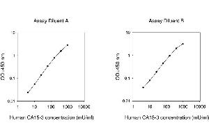 Typical Data: These standard curves are for demonstration only. A standard curve must be run with each assay. Assay Diluent A Human CA15-3 concentration (mU/mL) 1 10 100 1000 10000 O D =4 50 n m 0.01 0.1 1 10 Assay Diluent B Human CA15-3 concentration (mU/mL) 1 10 100 1000 10000 O D =4 50 n m 0.01 0.1 1 10