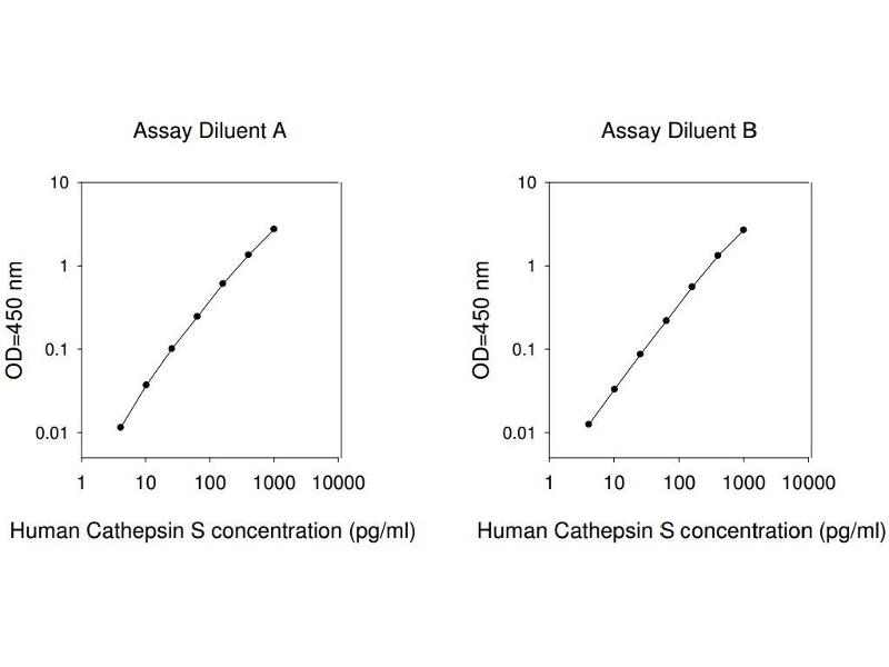 Typical Data: These standard curves are for demonstration only. A standard curve must be run with each assay. Assay Diluent A Human Cathepsin S concentration (pg/mL) 1 10 100 1000 10000 O D =4 50 n m 0.01 0.1 1 10 Assay Diluent B Human Cathepsin S concentration (pg/mL) 1 10 100 1000 10000 O D =4 50 n m 0.01 0.1 1 10