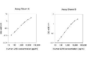 Typical Data: These standard curves are for demonstration only. A standard curve must be run with each assay. Assay Diluent A Human DAN concentration (pg/mL) O D =4 50 n m 0.001 0.01 0.1 1 10 10 100 1,000 10,000 100,000 Assay Diluent B Human DAN concentration (pg/mL) O D =4 50 n m 0.01 0.1 1 10 10 100 1,000 10,000 100,000