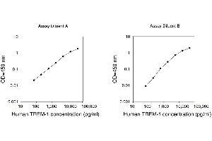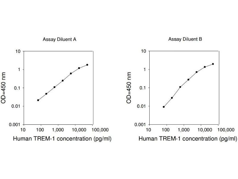 Typical Data: These standard curves are for demonstration only. A standard curve must be run with each assay. Human TREM-1 concentration (pg/mL) O D =4 50 n m 0.001 0.01 0.1 1 10 Assay Diluent A 10 100 1,000 10,000 100,000 Human TREM-1 concentration (pg/mL) O D =4 50 n m 0.001 0.01 0.1 1 10 Assay Diluent B 10 100 1,000 10,000 100,000
