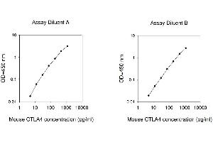 Typical Data: These standard curves are for demonstration only. A standard curve must be run with each assay. Assay Diluent A Mouse CTLA4 concentration (pg/mL) 1 10 100 1000 10000 O D =4 50 n m 0.01 0.1 1 10 Assay Diluent B Mouse CTLA4 concentration (pg/mL) 1 10 100 1000 10000 O D =4 50 n m 0.01 0.1 1 10