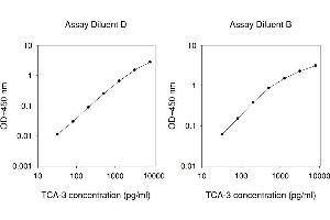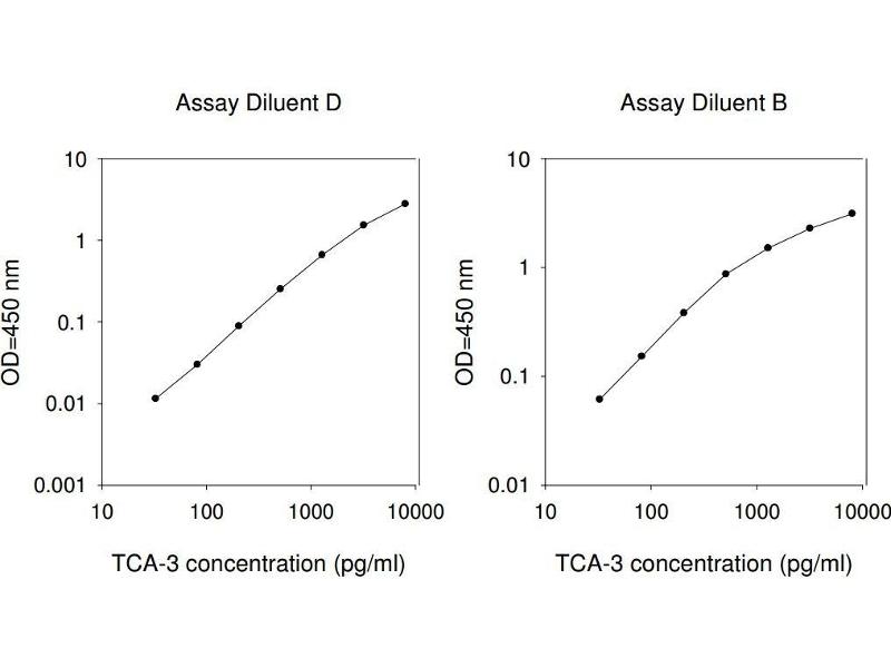 - Bring all reagents and samples to room temperature (18 - 25°C) before use. 2. Sample dilution: 1x Assay Diluent D (Item K) is used for dilution of serum/plasma samples, 1x Assay Diluent B (Item E) can be used for dilution of cell culture supernates. If your samples need to be diluted, 1x Assay Diluent D (Item K) should be used for dilution of serum/plasma samples. 1x Assay Diluent B (Item E) should be used for dilution of cell culture supernatants and urine. Suggested dilution for normal serum/plasma: 2-fold*. 3. Assay Diluent B and Assay Diluent D should be diluted 5-fold with deionized or distilled water before use. 4. Preparation of standard: Briefly spin the vial of Item C and then add 400 µl 1x Assay Diluent D (for serum/plasma samples) or 1x Assay Diluent B (for cell culture supernates) into Item C vial to prepare a 50 ng/ml standard. Dissolve the powder thoroughly by a gentle mix. Add 80 µl TCA-3 standard (50 ng/ml) from the vial of Item C, into a tube with 420 µl 1x Assay Diluent D or 1x Assay Diluent B to prepare a 8,000 pg/ml standard solution. Pipette 300 µl 1x Assay Diluent D or 1x Assay Diluent B into each tube. Use the 8,000 pg/ml standard solution to produce a dilution series (shown below). Mix each tube thoroughly before the next transfer. Gently vortex to mix. 1x Assay Diluent D or 1x Assay Diluent B serves as the zero standard (0 pg/ml). 5. If the Wash Concentrate (20x) (Item B) contains visible crystals, warm to room temperature and mix gently until dissolved. Dilute 20 ml of Wash Buffer Concentrate into deionized or distilled water to yield 400 ml of 1x Wash Buffer. 6. Briefly spin the Detection Antibody vial (Item F) before use. Add 100 µl of 1x Assay Diluent B into the vial to prepare a detection antibody concentrate. Pipette up and down to mix gently (the concentrate can be stored at 4°C for 5 days). The detection antibody concentrate should be diluted 80-fold with 1x Assay Diluent B and used in step 4 of Part VI Assay Procedure. 7. Briefly spin the HRP-Streptavidin concentrate vial (Item G) and pipette up and down to mix gently before use. HRP-Streptavidin concentrate should be diluted 35,000-fold with 1x Assay Diluent B. For example: Briefly spin the vial (Item G) and pipette up and down to mix gently . Add 2 µl of HRP-Streptavidin concentrate into a tube with 198 µl 1x Assay Diluent B to prepare a 100-fold diluted HRP- Streptavidin solution (do not store the diluted solution for next day use). Mix through and then pipette 40 µl of prepared 100-fold diluted solution into a tube with 14 ml 1x Assay Diluent B to prepare a final 35,000 fold diluted HRP-Streptavidin solution.