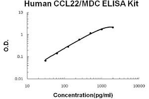 Background: Macrophage-derived chemokine(MDC), also called Chemokine, cc motif, ligand 22(CCL22) or Small inducible cytokine subfamily A, member 22(SCY22). MDC is a recently identified member of the CC chemokine family. It is not closely related to other chemokines, sharing most similarity with thymus- and activation-regulated chemokine(TARC), which contains 37 % identical amino acids. In addition, MDC gene is mapped to chromosome 16q13, the same position reported for the TARC gene. MDC has the four-cysteine motif and other highly conserved residues characteristic of CC chemokines, but it shares<35 % identity with any of the known chemokines. Recombinant MDC was expressed in Chinese hamster ovary cells and purified by heparin-Sepharose chromatography. MDC is highly expressed in macrophages and in monocyte-derived dendritic cells, but not in monocytes, natural killer cells, or several cell lines of epithelial, endothelial, or fibroblast origin. High expression was also detected in normal thymus and less expression in lung and spleen. MDC is thus a unique member of the CC chemokine family that may play a fundamental role in the function of dendritic cells, natural killer cells, and monocytes.