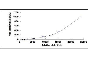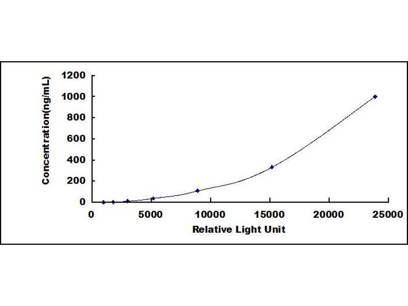 In order to make the calculation easier, we plot the RLU value of the standard (X-axis) against the known concentration of the standard (Y-axis), although concentration is indeed the independent variable while RLU value is the dependent variable. Further, in this part, in order to help the customer perform the assay more visual, we provide the customer with the raw data (not the log of data). However, plotting log of the data to construct the curve will be recommended. The RLU values of the standard curve may vary according to the conditions of assay performance (e.g. operator, pipetting technique, washing technique or temperature effects). This curve is provided for demonstration only. The customers should establish their own standard curve for each test conducted. -