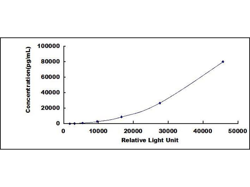In order to make the calculation easier, we plot the RLU value of the standard (X-axis) against the known concentration of the standard (Y-axis), although concentration is indeed the independent variable while RLU value is the dependent variable. Further, in this part, in order to help the customer perform the assay more visual, we provide the customer with the raw data (not the log of data). However, plotting log of the data to construct the curve will be recommended. The RLU values of the standard curve may vary according to the conditions of assay performance (e.g. operator, pipetting technique, washing technique or temperature effects). This curve is provided for demonstration only. The customers should establish their own standard curve for each test conducted. -