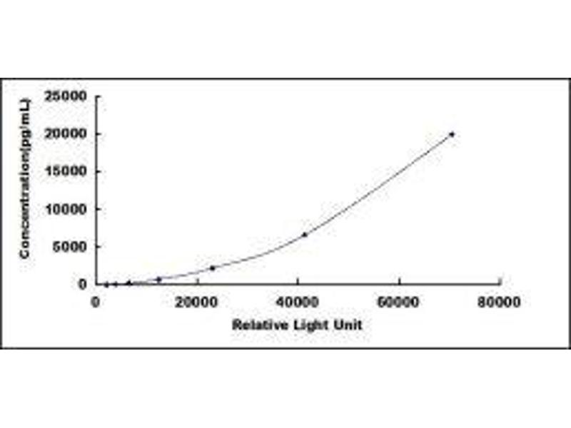 In order to make the calculation easier, we plot the RLU value of the standard (X-axis) against the known concentration of the standard (Y-axis), although concentration is indeed the independent variable while RLU value is the dependent variable. Further, in this part, in order to help the customer perform the assay more visual, we provide the customer with the raw data (not the log of data). However, plotting log of the data to construct the curve will be recommended. The RLU values of the standard curve may vary according to the conditions of assay performance (e.g. operator, pipetting technique, washing technique or temperature effects). This curve is provided for demonstration only. The customers should establish their own standard curve for each test conducted.