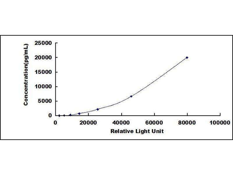 In order to make the calculation easier, we plot the RLU value of the standard (X-axis) against the known concentration of the standard (Y-axis), although concentration is indeed the independent variable while RLU value is the dependent variable. Further, in this part, in order to help the customer perform the assay more visual, we provide the customer with the raw data (not the log of data). However, plotting log of the data to construct the curve will be recommended. The RLU values of the standard curve may vary according to the conditions of assay performance (e.g. operator, pipetting technique, washing technique or temperature effects). This curve is provided for demonstration only. The customers should establish their own standard curve for each test conducted.
