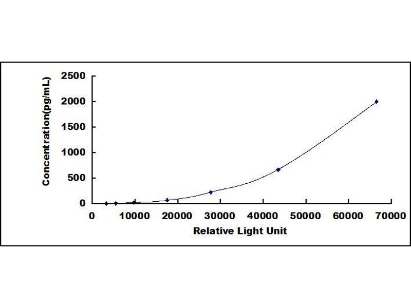 In order to make the calculation easier, we plot the RLU value of the standard (X-axis) against the known concentration of the standard (Y-axis), although concentration is indeed the independent variable while RLU value is the dependent variable. Further, in this part, in order to help the customer perform the assay more visual, we provide the customer with the raw data (not the log of data). However, plotting log of the data to construct the curve will be recommended. The RLU values of the standard curve may vary according to the conditions of assay performance (e.g. operator, pipetting technique, washing technique or temperature effects). This curve is provided for demonstration only. The customers should establish their own standard curve for each test conducted. -