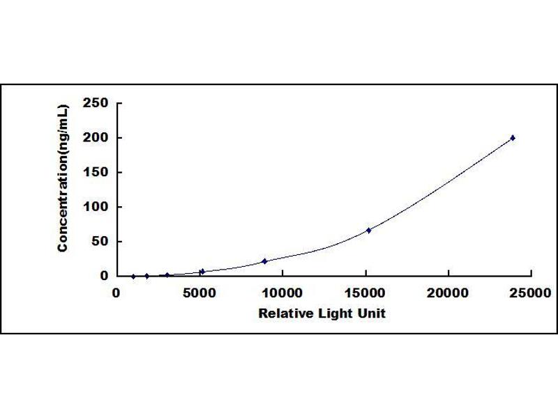 In order to make the calculation easier, we plot the RLU value of the standard (X-axis) against the known concentration of the standard (Y-axis), although concentration is indeed the independent variable while RLU value is the dependent variable. Further, in this part, in order to help the customer perform the assay more visual, we provide the customer with the raw data (not the log of data). However, plotting log of the data to construct the curve will be recommended. The RLU values of the standard curve may vary according to the conditions of assay performance (e.g. operator, pipetting technique, washing technique or temperature effects). This curve is provided for demonstration only. The customers should establish their own standard curve for each test conducted. -