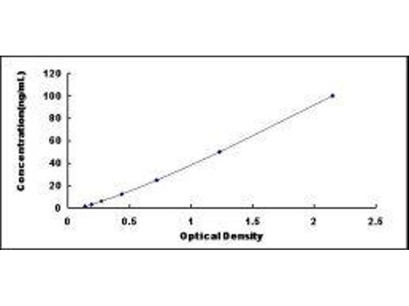2. Standard - Reconstitute the Standard with 1.0 mL of Standard Diluent, keep for 10 minutes at room temperature, shake gently (not to foam). The concentration of the standard in the stock solution is 200 ng/mL. Firstly dilute the stock solution to 100 ng/mL and the diluted standard serves as the highest standard (100 ng/mL). Then prepare 7 tubes containing 0.5 mL Standard Diluent and use the diluted standard to produce a double dilution series. Mix each tube thoroughly before the next transfer. Set up 7 points of diluted standard such as 100 ng/mL, 50 ng/mL, 25 ng/mL, 12.5 ng/mL, 6.25 ng/mL, 3.12 ng/mL, 1.56 ng/mL, and the last microcentrifuge tube with Standard Diluent is the blank as 0 ng/mL.