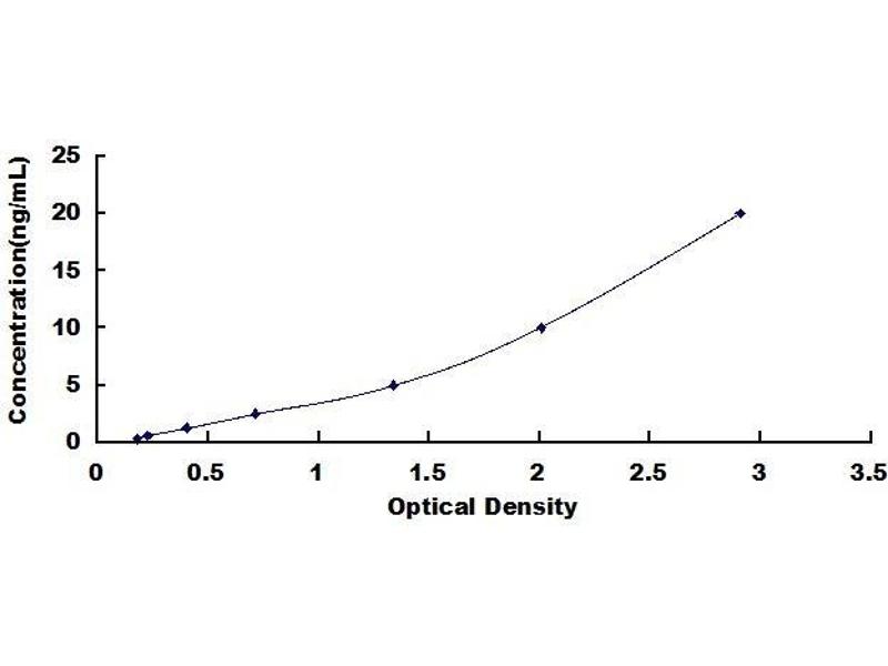 2. Standard - Reconstitute the Standard with 1.0 mL of Standard Diluent, keep for 10 minutes at room temperature, shake gently (not to foam). The concentration of the standard in the stock solution is 160 ng/mL. Firstly dilute the stock solution to 20 ng/mL and the diluted standard serves as the highest standard (20 ng/mL). Then prepare 7 tubes containing 0.5 mL Standard Diluent and use the diluted standard to produce a double dilution series. Mix each tube thoroughly before the next transfer. Set up 7 points of diluted standard such as 20 ng/mL, 10 ng/mL, 5 ng/mL, 2.5 ng/mL, 1.25 ng/mL, 0.625 ng/mL, 0.312 ng/mL, and the last microcentrifuge tube with Standard Diluent is the blank as 0 ng/mL.