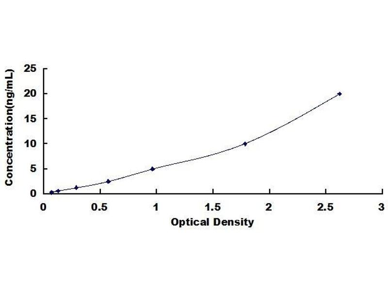 2. Standard - Reconstitute the Standard with 1.0 mL of Standard Diluent, keep for 10 minutes at room temperature, shake gently (not to foam). The concentration of the standard in the stock solution is 100 ng/mL. Firstly dilute the stock solution to 20 ng/mL and the diluted standard serves as the highest standard (20 ng/mL). Then prepare 7 tubes containing 0.5 mL Standard Diluent and use the diluted standard to produce a double dilution series. Mix each tube thoroughly before the next transfer. Set up 7 points of diluted standard such as 20 ng/mL, 10 ng/mL, 5 ng/mL, 2.5 ng/mL, 1.25 ng/mL, 0.625 ng/mL, 0.312 ng/mL, and the last microcentrifuge tube with Standard Diluent is the blank as 0 ng/mL.