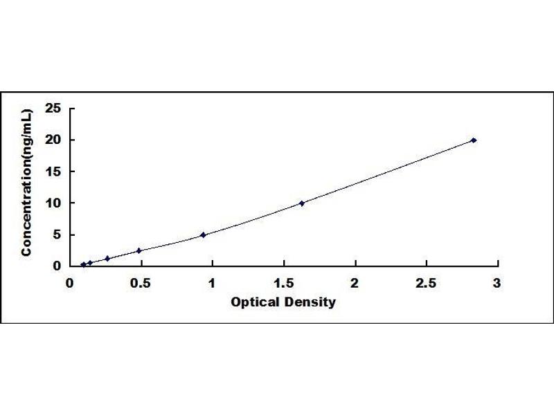 2. Standard - Reconstitute the Standard with 1.0 mL of Standard Diluent, keep for 10 minutes at room temperature, shake gently (not to foam). The concentration of the standard in the stock solution is 20 ng/mL. Prepare 7 tubes containing 0.5 mL Standard Diluent and produce a double dilution series. Mix each tube thoroughly before the next transfer. Set up 7 points of diluted standard such as 20 ng/mL, 10 ng/mL, 5 ng/mL, 2.5 ng/mL, 1.25 ng/mL, 0.625 ng/mL, 0.312 ng/mL, and the last microcentrifuge tube with Standard Diluent is the blank as 0 ng/mL.