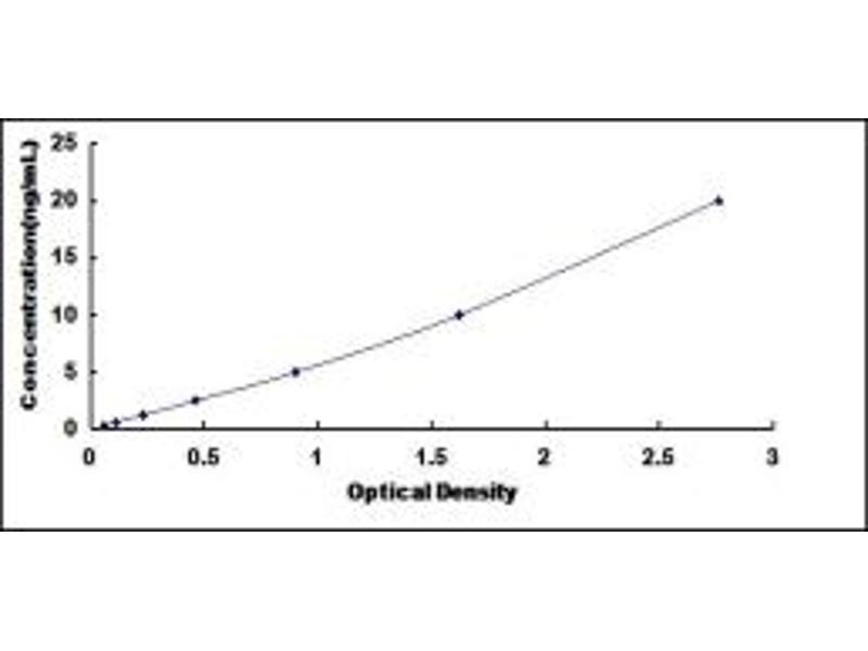 2. Standard - Reconstitute the Standard with 1.0 mL of Standard Diluent, keep for 10 minutes at room temperature, shake gently (not to foam). The concentration of the standard in the stock solution is 20 ng/mL. Prepare 7 tubes containing 0.5 mL Standard Diluent and produce a double dilution series. Mix each tube thoroughly before the next transfer. Set up 7 points of diluted standard such as 20 ng/mL, 10 ng/mL, 5 ng/mL, 2.5 ng/mL, 1.25 ng/mL, 0.625 ng/mL, 0.312 ng/mL, and the last microcentrifuge tube with Standard Diluent is the blank as 0 ng/mL.