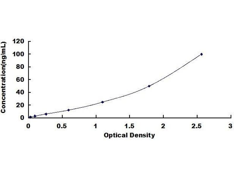 2. Standard - Reconstitute the Standard with 1.0 mL of Standard Diluent, keep for 10 minutes at room temperature, shake gently (not to foam). The concentration of the standard in the stock solution is 100 ng/mL. Prepare 7 tubes containing 0.5 mL Standard Diluent and produce a double dilution series. Mix each tube thoroughly before the next transfer. Set up 7 points of diluted standard such as 100 ng/mL, 50 ng/mL, 25 ng/mL, 12.5 ng/mL, 6.25 ng/mL, 3.12 ng/mL, 1.56 ng/mL, and the last microcentrifuge tube with Standard Diluent is the blank as 0 ng/mL.