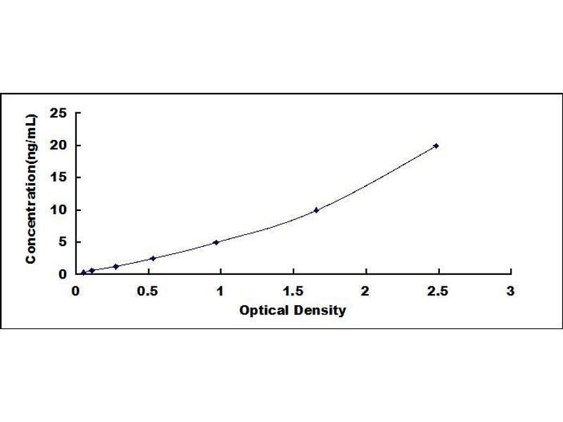 2. Standard - Reconstitute the Standard with 1.0 mL of Standard Diluent, keep for 10 minutes at room temperature, shake gently (not to foam). The concentration of the standard in the stock solution is 40 ng/mL. Firstly dilute the stock solution to 20 ng/mL and the diluted standard serves as the highest standard (20 ng/mL). Then prepare 7 tubes containing 0.5 mL Standard Diluent and use the diluted standard to produce a double dilution series. Mix each tube thoroughly before the next transfer. Set up 7 points of diluted standard such as 20 ng/mL, 10 ng/mL, 5 ng/mL, 2.5 ng/mL, 1.25 ng/mL, 0.625 ng/mL, 0.312 ng/mL, and the last microcentrifuge tube with Standard Diluent is the blank as 0 ng/mL.