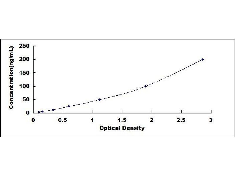 In order to make the calculation easier, we plot the O.D. value of the standard (X-axis) against the log of concentration of the standard (Y-axis), although concentration is the independent variable and O.D. value is the dependent variable. The O.D. values of the standard curve may vary according to the conditions of assay performance (e.g. operator, pipetting technique, washing technique or temperature effects). Typical standard curve below is provided for reference only. -