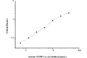 Intra-assay Precision (Precision within an assay): 3 samples with low, mid range and high level Human PCPE1 were tested 20 times on one plate, respectively. Inter-assay Precision (Precision between assays): 3 samples with low, mid range and high level Human PCPE1 were tested on 3 different plates, 20 replicates in each plate. Both intra-CV and inter-CV are < 10 %.
