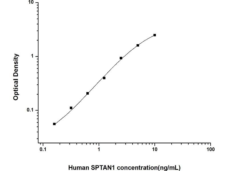 Intra-assay Precision (Precision within an assay): 3 samples with low, mid range and high level Human SPTAN1 were tested 20 times on one plate, respectively. Inter-assay Precision (Precision between assays): 3 samples with low, mid range and high level Human SPTAN1 were tested on 3 different plates, 20 replicates in each plate. Both intra-CV and inter-CV are < 10 %.