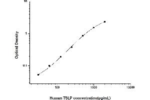 Intra-assay Precision (Precision within an assay): 3 samples with low, mid range and high level Human TSLP were tested 20 times on one plate, respectively. Inter-assay Precision (Precision between assays): 3 samples with low, mid range and high level Human TSLP were tested on 3 different plates, 20 replicates in each plate. Both intra-CV and inter-CV are < 10 %.