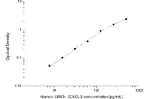 Intra-assay Precision (Precision within an assay): 3 samples with low, mid range and high level Human GROγ/CXCL3 were tested 20 times on one plate, respectively. Inter-assay Precision (Precision between assays): 3 samples with low, mid range and high level Human GROγ/CXCL3 were tested on 3 different plates, 20 replicates in each plate. Both intra-CV and inter-CV are < 10 %.