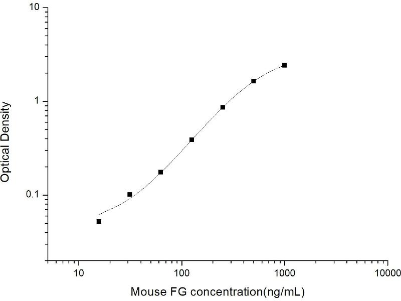 Intra-assay Precision (Precision within an assay): 3 samples with low, mid range and high level Mouse FG were tested 20 times on one plate, respectively. Inter-assay Precision (Precision between assays): 3 samples with low, mid range and high level Mouse FG were tested on 3 different plates, 20 replicates in each plate. Both intra-CV and inter-CV are < 10 %.
