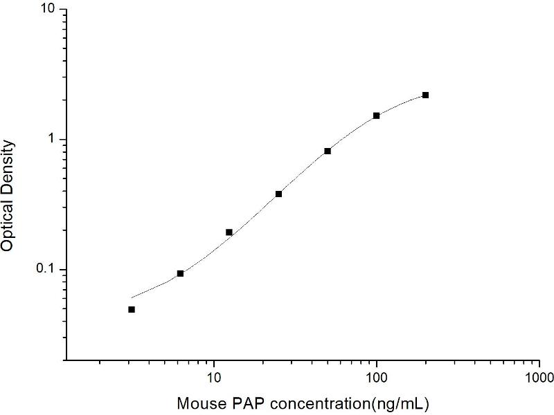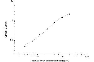 Intra-assay Precision (Precision within an assay): 3 samples with low, mid range and high level Mouse PAP were tested 20 times on one plate, respectively. Inter-assay Precision (Precision between assays): 3 samples with low, mid range and high level Mouse PAP were tested on 3 different plates, 20 replicates in each plate. Both intra-CV and inter-CV are < 10 %.