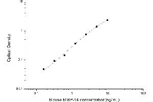 Intra-assay Precision (Precision within an assay): 3 samples with low, mid range and high level Mouse MMP-14 were tested 20 times on one plate, respectively. Inter-assay Precision (Precision between assays): 3 samples with low, mid range and high level Mouse MMP-14 were tested on 3 different plates, 20 replicates in each plate. Both intra-CV and inter-CV are < 10 %.