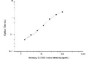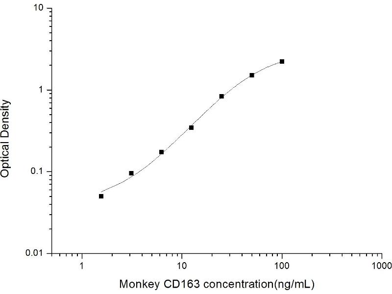 Intra-assay Precision (Precision within an assay): 3 samples with low, mid range and high level Monkey CD163 were tested 20 times on one plate, respectively. Inter-assay Precision (Precision between assays): 3 samples with low, mid range and high level Monkey CD163 were tested on 3 different plates, 20 replicates in each plate. Both intra-CV and inter-CV are < 10 %.