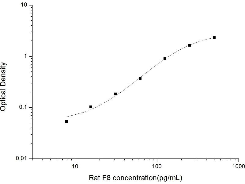 Intra-assay Precision (Precision within an assay): 3 samples with low, mid range and high level Rat F8 were tested 20 times on one plate, respectively. Inter-assay Precision (Precision between assays): 3 samples with low, mid range and high level Rat F8 were tested on 3 different plates, 20 replicates in each plate. Both intra-CV and inter-CV are < 10 %.