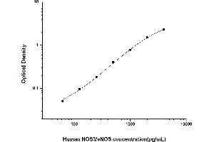 Intra-assay Precision (Precision within an assay): 3 samples with low, mid range and high level Human NOS3/eNOS were tested 20 times on one plate, respectively. Inter-assay Precision (Precision between assays): 3 samples with low, mid range and high level Human NOS3/eNOS were tested on 3 different plates, 20 replicates in each plate. Both intra-CV and inter-CV are < 10 %.