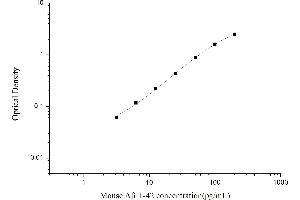 Intra-assay Precision (Precision within an assay): 3 samples with low, mid range and high level Mouse Aβ1-42 were tested 20 times on one plate, respectively. Inter-assay Precision (Precision between assays): 3 samples with low, mid range and high level Mouse Aβ1-42 were tested on 3 different plates, 20 replicates in each plate. Both intra-CV and inter-CV are < 10 %.