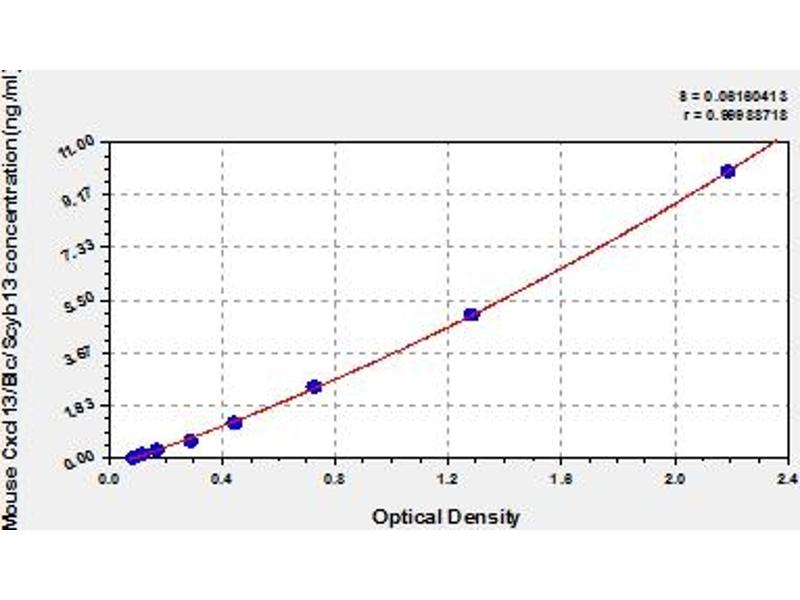 This assay has high sensitivity and excellent specificity for detection of mouse Cxcl13/Blc/Scyb13. No significant cross-reactivity or interference between mouse Cxcl13/Blc/Scyb13 and analogues was observed. Note: Limited by current skills and knowledge, it is impossible for us to complete the cross-reactivity detection between mouse Cxcl13/Blc/Scyb13 and all the analogues, therefore, cross reaction may still exist.
