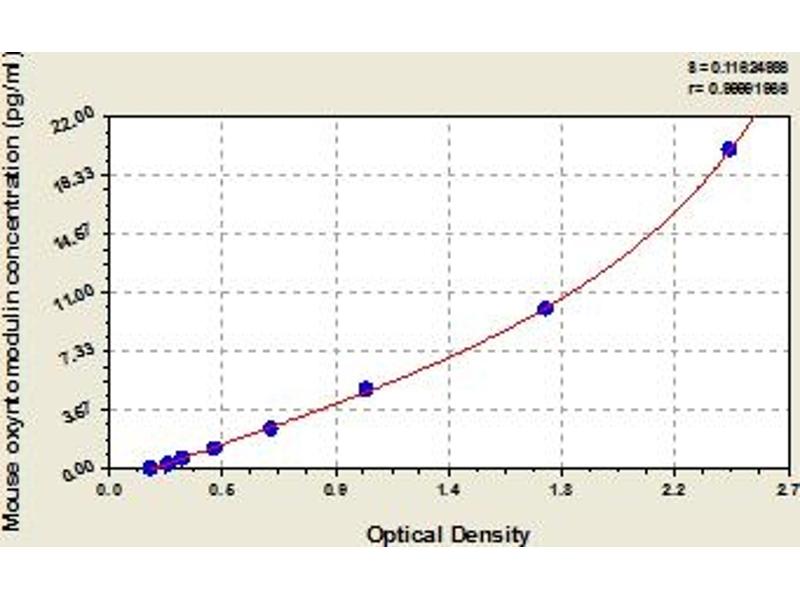 This assay has high sensitivity and excellent specificity for detection of mouse oxyntomodulin. No significant cross-reactivity or interference between mouse oxyntomodulin and analogues was observed. Note: Limited by current skills and knowledge, it is impossible for us to complete the cross-reactivity detection between mouse oxyntomodulin and all the analogues, therefore, cross reaction may still exist.