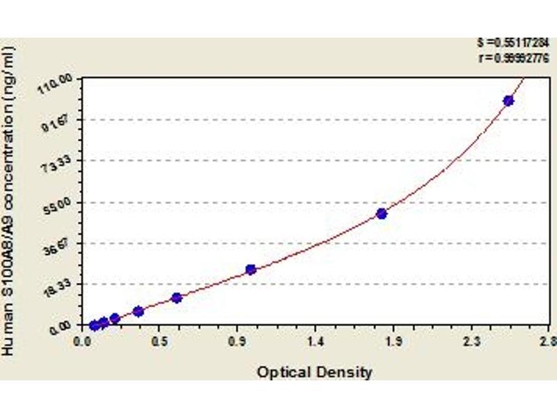 - For the quantitative determination of human S100 calcium-binding protein A8/A9 complex (S100A8/A9) concentrations in serum, plasma, tissue homogenates.