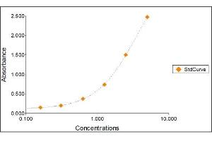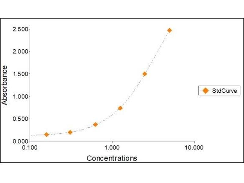 All samples and standards should be assayed in duplicates. 2. The Standards and the test sample(s) should be loaded into the ELISA wells as quickly as possible to avoid a shift in OD readings. Using a multichannel pipette would reduce this occurrence. Pipette 100 μL of Standard 0 (0.0 ng/mL) in duplicate Standard 1 (0.16 ng/mL) in duplicate Standard 2 (0.31 ng/mL) in duplicate Standard 3 (0.63 ng/mL) in duplicate Standard 4 (1.25 ng/mL) in duplicate Standard 5 (2.50 ng/mL) in duplicate Standard 6 (5 ng/mL) in duplicate 3. Pipette 100 μL of sample (in duplicate) into pre designated wells. 4. Incubate the micro titer plate at room temperature for sixty (60 ± 2) minutes. Keep plate covered and level during incubation. 5. Following incubation, aspirate the contents of the wells. 6. Completely fill each well with appropriately diluted Wash Solution and aspirate. Repeat three times, for a total of four washes. If washing manually: completely fill wells with wash buffer, invert the plate then pour/shake out the contents in a waste container. Follow this by sharply striking the wells on absorbent paper to remove residual buffer. Repeat 3 times for a total of four washes. 7. Pipette 100 μL of appropriately diluted Detection Antibody to each well. Incubate at room temperature for twenty (20 ± 2) minutes. Keep plate covered in the dark and level during incubation. 8. Wash and blot the wells as described in Steps 5/6. 9. Pipette 100 μL of appropriately diluted HRP-streptavidin to each well. Incubate at room temperature for twenty (20 ± 2) minutes. Keep plate covered in the dark and level during incubation. 10. Wash and blot the wells as described in Steps 5/6. 11. Pipette 100 μL of TMB Substrate Solution into each well. 12. Incubate in the dark at room temperature for precisely ten (10) minutes. 13. After ten minutes, add 100 μL of Stop Solution to each well. 14. Determine the absorbance (450 nm) of the contents of each well within 30 minutes. Calibrate the plate reader to manufacturer’s specifications.
