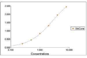2. The Standards and the test sample(s) should be loaded into the ELISA wells as quickly as possible to avoid a shift in OD readings. Using a multichannel pipette would reduce this occurrence. Pipette 100 μL of Standard 0 (0.0 ng/mL) in duplicate Standard 1 (0.25 ng/mL) in duplicate Standard 2 (0.50 ng/mL) in duplicate Standard 3 (1 ng/mL) in duplicate Standard 4 (2 ng/mL) in duplicate Standard 5 (4 ng/mL) in duplicate Standard 6 (8 ng/mL) in duplicate