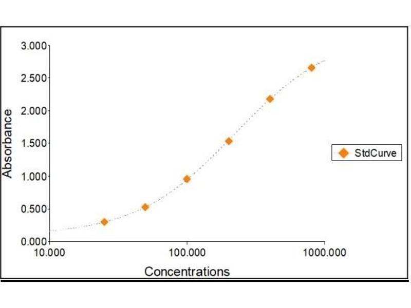 2. The Standards and the test sample(s) should be loaded into the ELISA wells as quickly as possible to avoid a shift in OD readings. Using a multichannel pipette would reduce this occurrence. Pipette 100 μL of Standard 0 (0.0 ng/mL) in duplicate Standard 1 (25 ng/mL) in duplicate Standard 2 (50 ng/mL) in duplicate Standard 3 (100 ng/mL) in duplicate Standard 4 (200 ng/mL) in duplicate Standard 5 (400 ng/mL) in duplicate Standard 6 (800 ng/mL) in duplicate