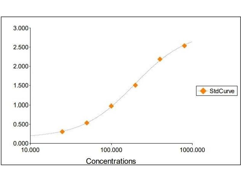 All samples and standards should be assayed in duplicates. 2. The Standards and the test sample(s) should be loaded into the ELISA wells as quickly as possible to avoid a shift in OD readings. Using a multichannel pipette would reduce this occurrence. Pipette 100 μL of Standard 0 (0.0 ng/mL) in duplicate Standard 1 (25 ng/mL) in duplicate Standard 2 (50 ng/mL) in duplicate Standard 3 (100 ng/mL) in duplicate Standard 4 (200 ng/mL) in duplicate Standard 5 (400 ng/mL) in duplicate Standard 6 (800 ng/mL) in duplicate 3. Pipette 100 μL of sample (in duplicate) into pre designated wells. 4. Incubate the micro titer plate at room temperature for sixty (60 ± 2) minutes. Keep plate covered and level during incubation. 5. Following incubation, aspirate the contents of the wells. 6. Completely fill each well with appropriately diluted Wash Solution and aspirate. Repeat three times, for a total of four washes. If washing manually: completely fill wells with wash buffer, invert the plate then pour/shake out the contents in a waste container. Follow this by sharply striking the wells on absorbent paper to remove residual buffer. Repeat 3 times for a total of four washes. 7. Pipette 100 μL of appropriately diluted Enzyme-Antibody Conjugate to each well. Incubate at room temperature for thirty (30 ± 2) minutes. Keep plate covered in the dark and level during incubation. 8. Wash and blot the wells as described in Steps 5/6. 9. Pipette 100 μL of TMB Substrate Solution into each well. 10. Incubate in the dark at room temperature for precisely ten (10) minutes. 11. After ten minutes, add 100 μL of Stop Solution to each well. 12. Determine the absorbance (450 nm) of the contents of each well within 30 minutes. Calibrate the plate reader to manufacturer’s specifications.