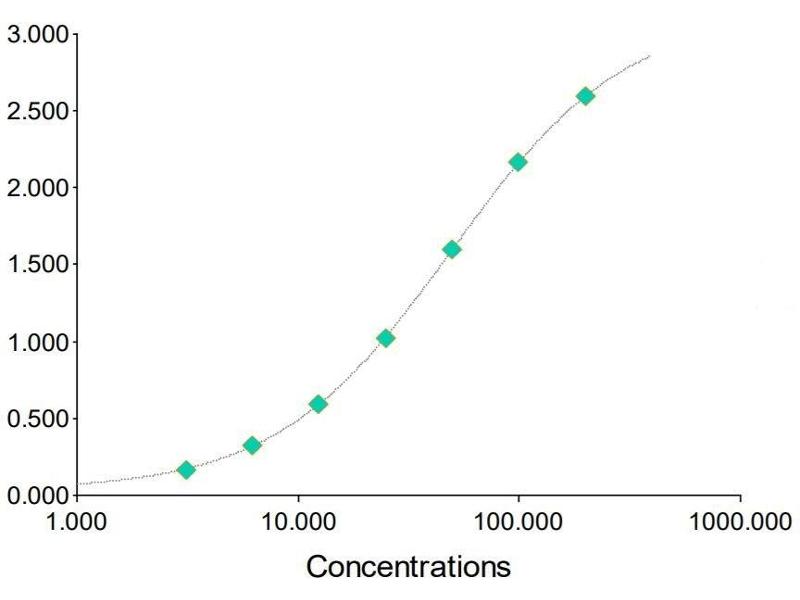 2. The Standards and the test sample(s) should be loaded into the ELISA wells as quickly as possible to avoid a shift in OD readings. Using a multichannel pipette would reduce this occurrence. Pipette 100 μL of Standard 0 (0.0 ng/mL) in duplicate Standard 1 (3.13 ng/mL) in duplicate Standard 2 (6.25 ng/mL) in duplicate Standard 3 (12.50 ng/mL) in duplicate Standard 4 (25 ng/mL) in duplicate Standard 5 (50 ng/mL) in duplicate Standard 6 (100 ng/mL) in duplicate Standard 7 (200 ng/mL) in duplicate