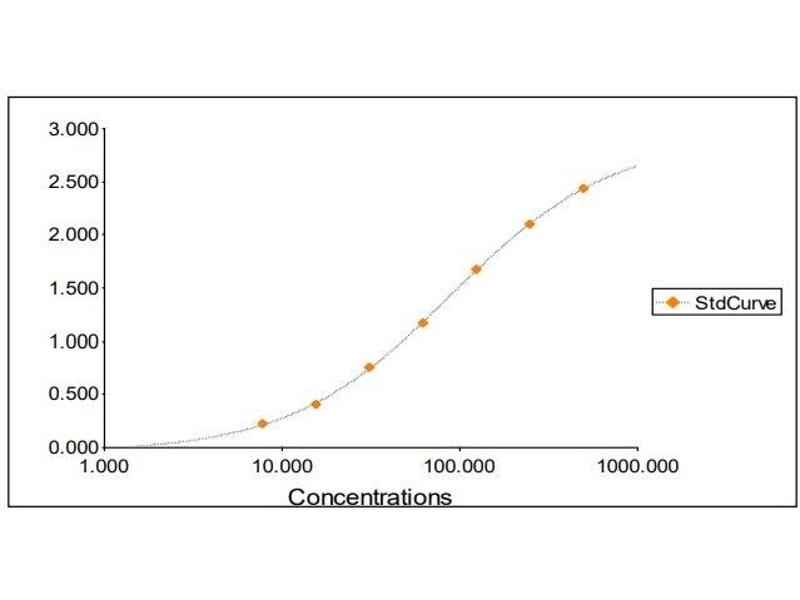 2. The Standards and the test sample(s) should be loaded into the ELISA wells as quickly as possible to avoid a shift in OD readings. Using a multichannel pipette would reduce this occurrence. Pipette 100 μL of Standard 0 (0.0 ng/mL) in duplicate Standard 1 (7.81 ng/mL) in duplicate Standard 2 (15.63 ng/mL) in duplicate Standard 3 (31.25 ng/mL) in duplicate Standard 4 (62.50 ng/mL) in duplicate Standard 5 (125 ng/mL) in duplicate Standard 6 (250 ng/mL) in duplicate Standard 7 (500 ng/mL) in duplicate