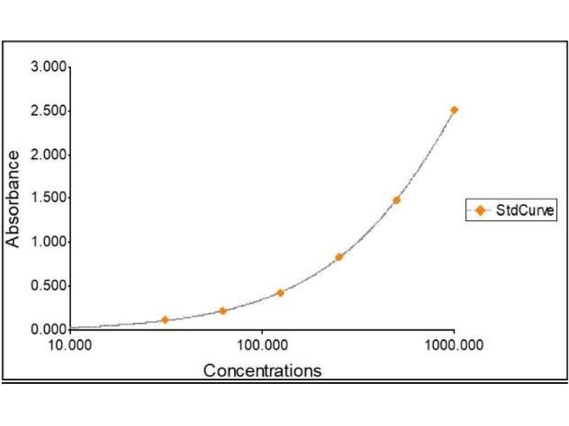All samples and standards should be assayed in duplicates. 2. The Standards and the test sample(s) should be loaded into the ELISA wells as quickly as possible to avoid a shift in OD readings. Using a multichannel pipette would reduce this occurrence. Pipette 100 μL of Standard 0 (0.0 pg/mL) in duplicate Standard 1 (31.25 pg/mL) in duplicate Standard 2 (62.50 pg/mL) in duplicate Standard 3 (125 pg/mL) in duplicate Standard 4 (250 pg/mL) in duplicate Standard 5 (500 pg/mL) in duplicate Standard 6 (1000 pg/mL) in duplicate 3. Pipette 100 μL of sample (in duplicate) into pre designated wells. 4. Incubate the micro titer plate while shaking on a microplate shaker at 400rpm at room temperature for one hundred and twenty (120 ± 2) minutes. Keep plate covered and level during incubation. 5. Following incubation, aspirate the contents of the wells. 6. Completely fill each well with appropriately diluted Wash Solution and aspirate. Repeat three times, for a total of four washes. If washing manually: completely fill wells with wash buffer, invert the plate then pour/shake out the contents in a waste container. Follow this by sharply striking the wells on absorbent paper to remove residual buffer. Repeat 3 times for a total of four washes. 7. Pipette 100 μL of appropriately diluted Detection Antibody to each well. Incubate while shaking on a microplate shaker at 400rpm at room temperature for twenty (20 ± 2) minutes. Keep plate covered in the dark and level during incubation. 8. Wash and blot the wells as described in Steps 5/6. 9. Pipette 100 μL of appropriately diluted HRP-streptavidin to each well. Incubate while shaking on a microplate shaker at 400rpm at room temperature for twenty (20 ± 2) minutes. Keep plate covered in the dark and level during incubation. 10. Wash and blot the wells as described in Steps 5/6. 11. Pipette 100 μL of TMB Substrate Solution into each well. 12. Incubate while shaking on a microplate shaker at 400rpm in the dark at room temperature for precisely ten (10) minutes. Keep plate covered in the dark and level during incubation. 13. After ten minutes, add 100 μL of Stop Solution to each well. 14. Determine the absorbance (450 nm) of the contents of each well within 30 minutes. Calibrate the plate reader to manufacturer’s specifications.