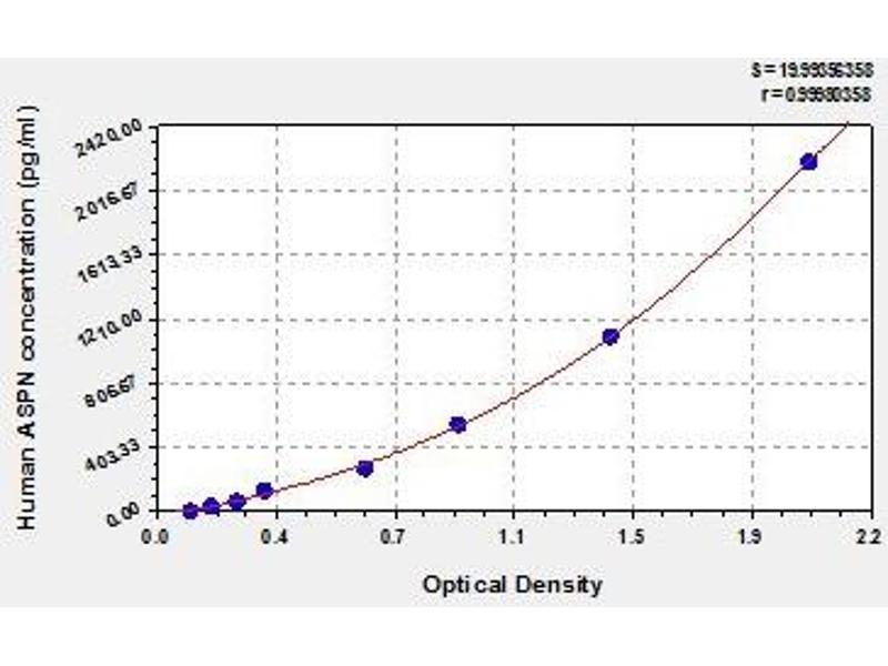 This assay employs the quantitative sandwich enzyme immunoassay technique. Antibody specific for ASPN has been pre-coated onto a microplate. Standards and samples are pipetted into the wells and any ASPN present is bound by the immobilized antibody. After removing any unbound substances, a biotin-conjugated antibody specific for ASPN is added to the wells. After washing, avidin conjugated Horseradish Peroxidase (HRP) is added to the wells. Following a wash to remove any unbound avidin-enzyme reagent, a substrate solution is added to the wells and color develops in proportion to the amount of ASPN bound in the initial step. The color development is stopped and the intensity of the color is measured.