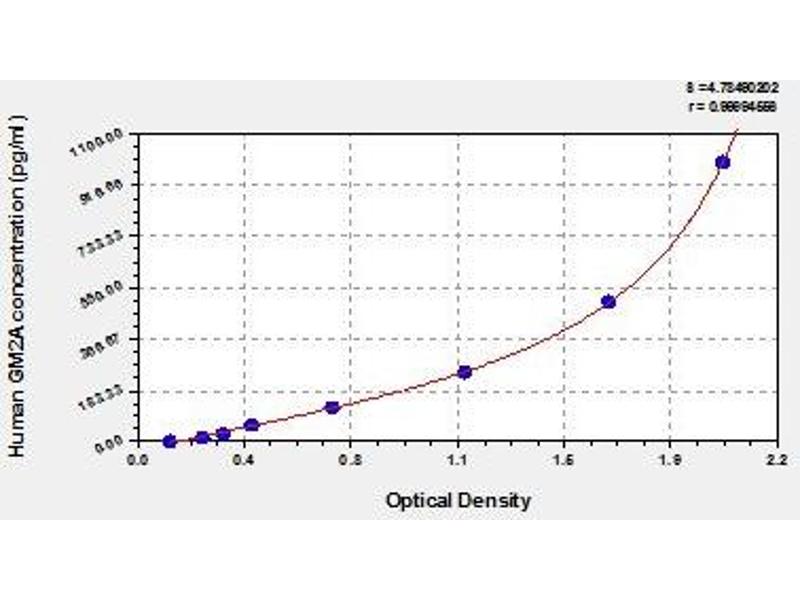 Antibody specific for GM2A has been pre-coated onto a microplate. Standards and samples are pipetted into the wells and any GM2A present is bound by the immobilized antibody. After removing any unbound substances, a biotin-conjugated antibody specific for GM2A is added to the wells. After washing, avidin conjugated Horseradish Peroxidase (HRP) is added to the wells. Following a wash to remove any unbound avidin-enzyme reagent, a substrate solution is added to the wells and color develops in proportion to the amount of GM2A bound in the initial step. The color development is stopped and the intensity of the color is measured.