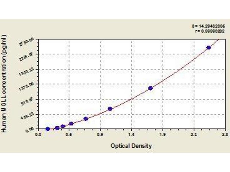 Antibody specific for MGLL has been pre-coated onto a microplate. Standards and samples are pipetted into the wells and any MGLL present is bound by the immobilized antibody. After removing any unbound substances, a biotin-conjugated antibody specific for MGLL is added to the wells. After washing, avidin conjugated Horseradish Peroxidase (HRP) is added to the wells. Following a wash to remove any unbound avidin-enzyme reagent, a substrate solution is added to the wells and color develops in proportion to the amount of MGLL bound in the initial step. The color development is stopped and the intensity of the color is measured.