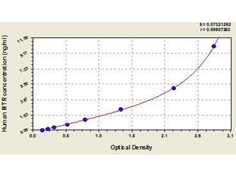 - Antibody specific for MTR has been pre-coated onto a microplate. Standards and samples are pipetted into the wells and any MTR present is bound by the immobilized antibody. After removing any unbound substances, a biotin-conjugated antibody specific for MTR is added to the wells. After washing, avidin conjugated Horseradish Peroxidase (HRP) is added to the wells. Following a wash to remove any unbound avidin-enzyme reagent, a substrate solution is added to the wells and color develops in proportion to the amount of MTR bound in the initial step. The color development is stopped and the intensity of the color is measured.
