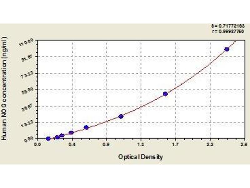 - Antibody specific for NOG has been pre-coated onto a microplate. Standards and samples are pipetted into the wells and any NOG present is bound by the immobilized antibody. After removing any unbound substances, a biotin-conjugated antibody specific for NOG is added to the wells. After washing, avidin conjugated Horseradish Peroxidase (HRP) is added to the wells. Following a wash to remove any unbound avidin-enzyme reagent, a substrate solution is added to the wells and color develops in proportion to the amount of NOG bound in the initial step. The color development is stopped and the intensity of the color is measured.
