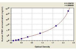 This assay employs the quantitative sandwich enzyme immunoassay technique. Antibody specific for PIM1 has been pre-coated onto a microplate. Standards and samples are pipetted into the wells and any PIM1 present is bound by the immobilized antibody. After removing any unbound substances, a biotin-conjugated antibody specific for PIM1 is added to the wells. After washing, avidin conjugated Horseradish Peroxidase (HRP) is added to the wells. Following a wash to remove any unbound avidin-enzyme reagent, a substrate solution is added to the wells and color develops in proportion to the amount of PIM1 bound in the initial step. The color development is stopped and the intensity of the color is measured.